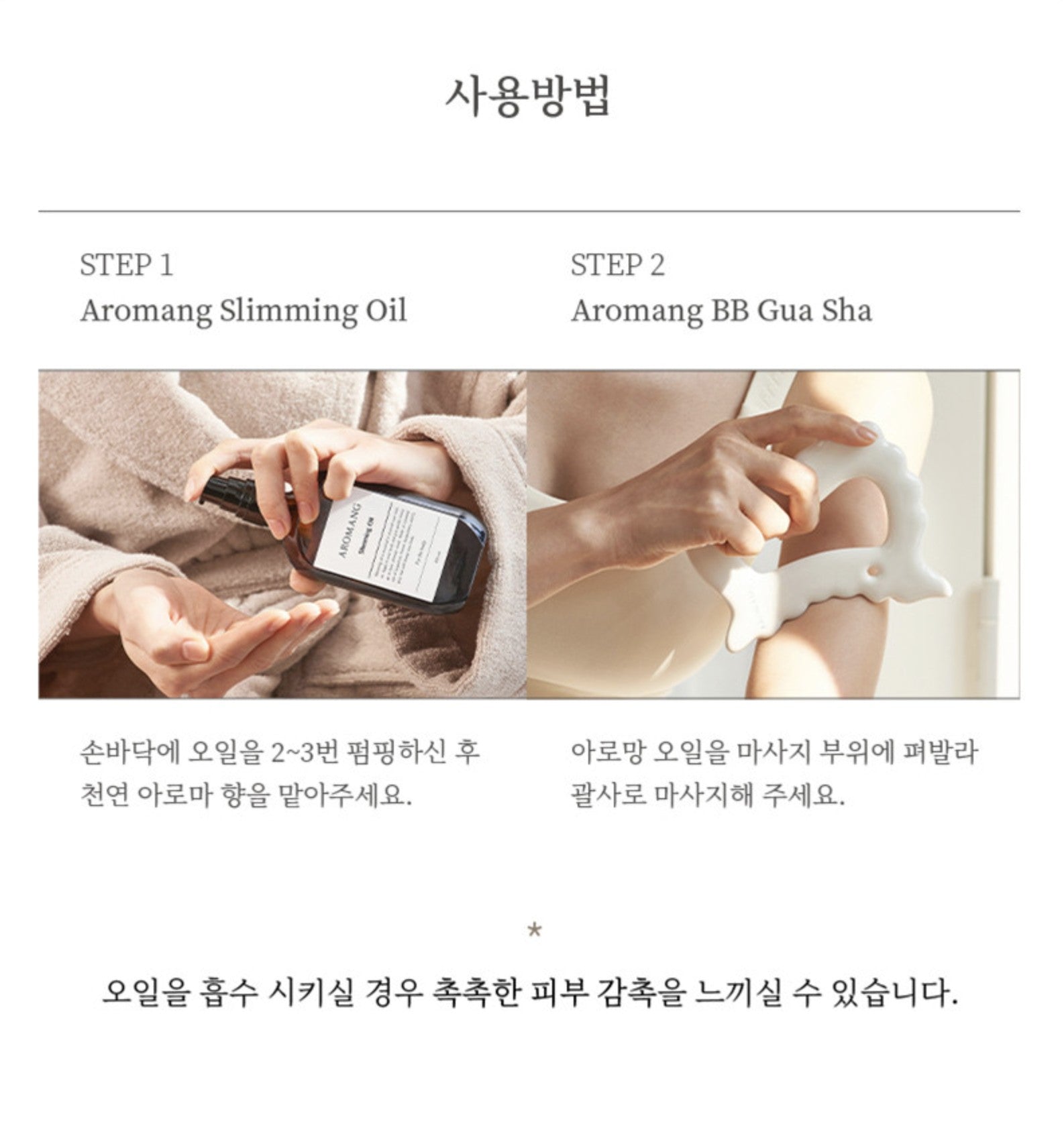 Step1: After pumping the oil 2-3 times on the palm, spread it evenly over the massage area. (Aroman Slimming Oil can have a good effect)