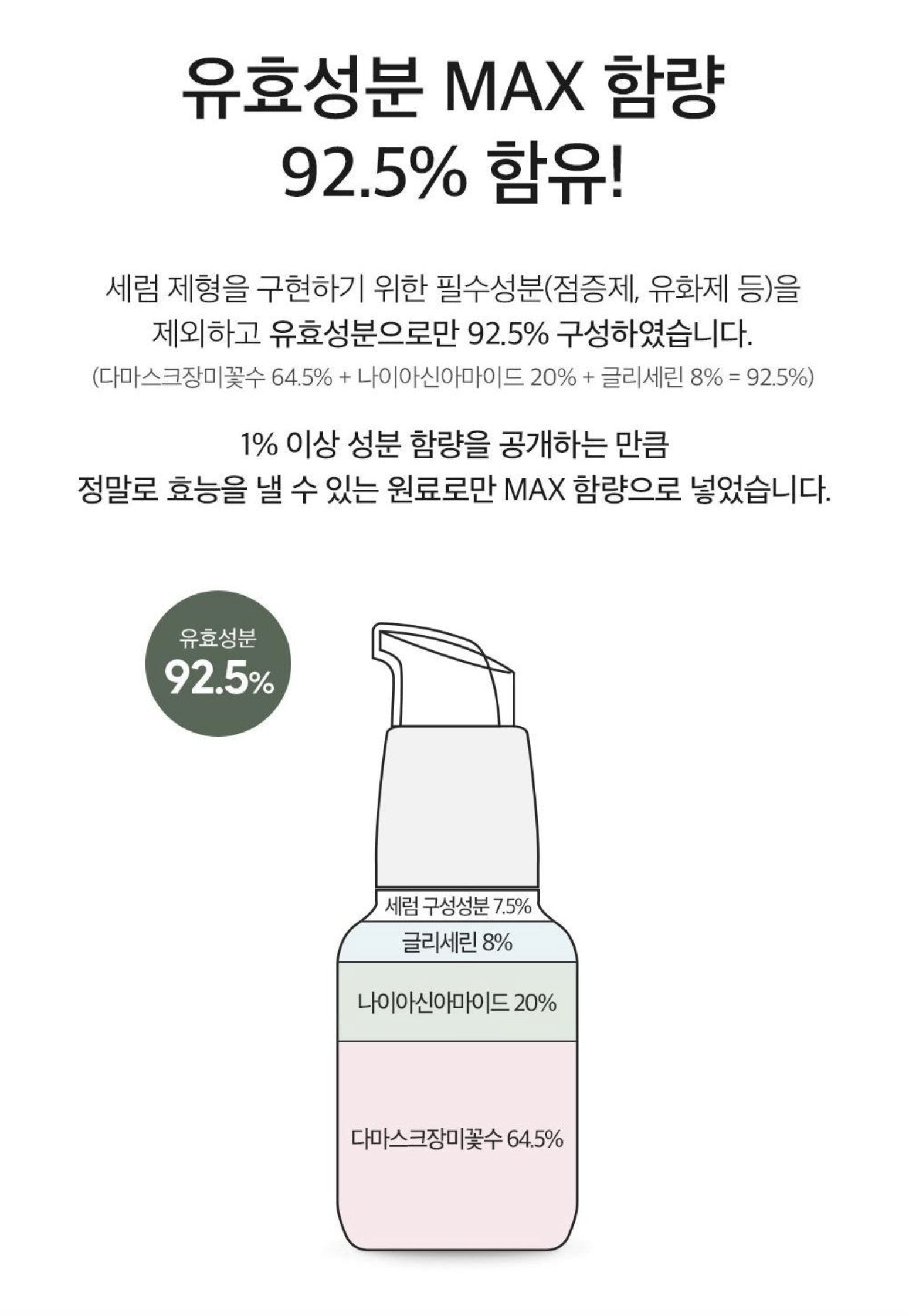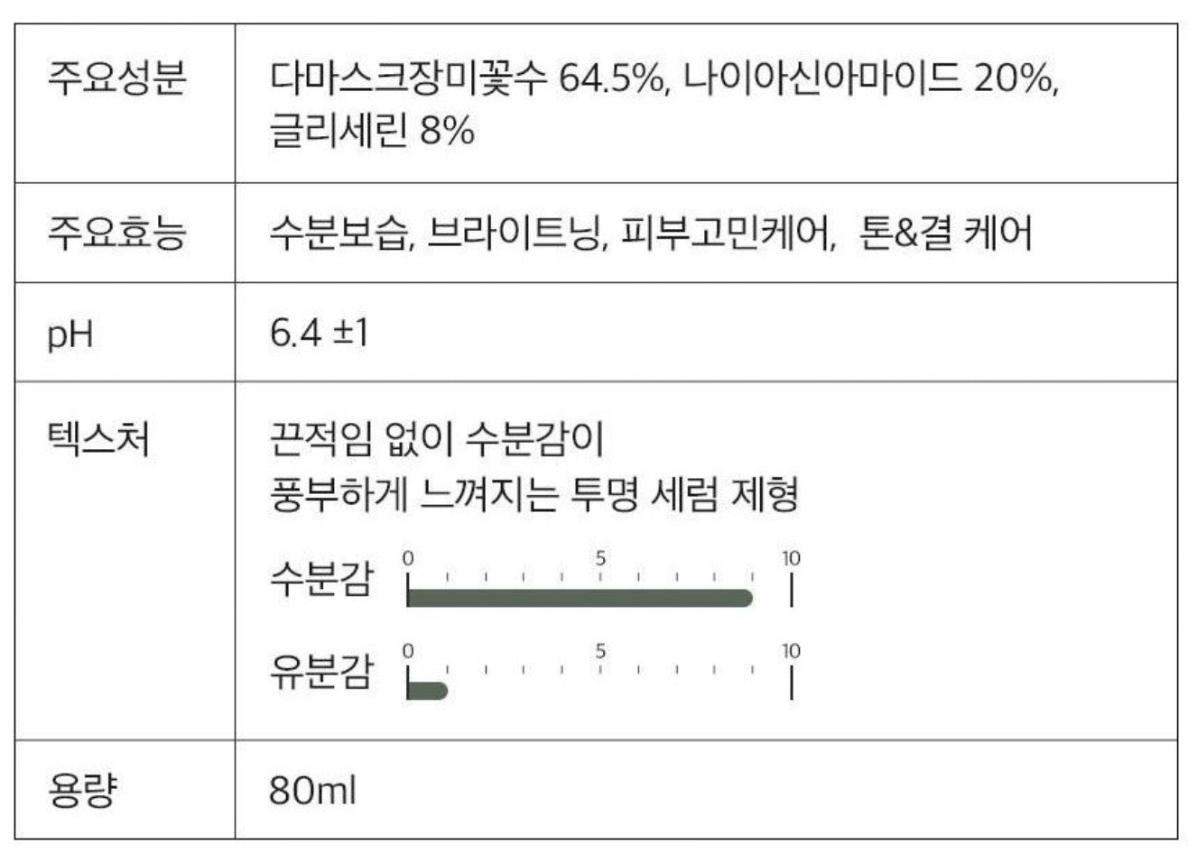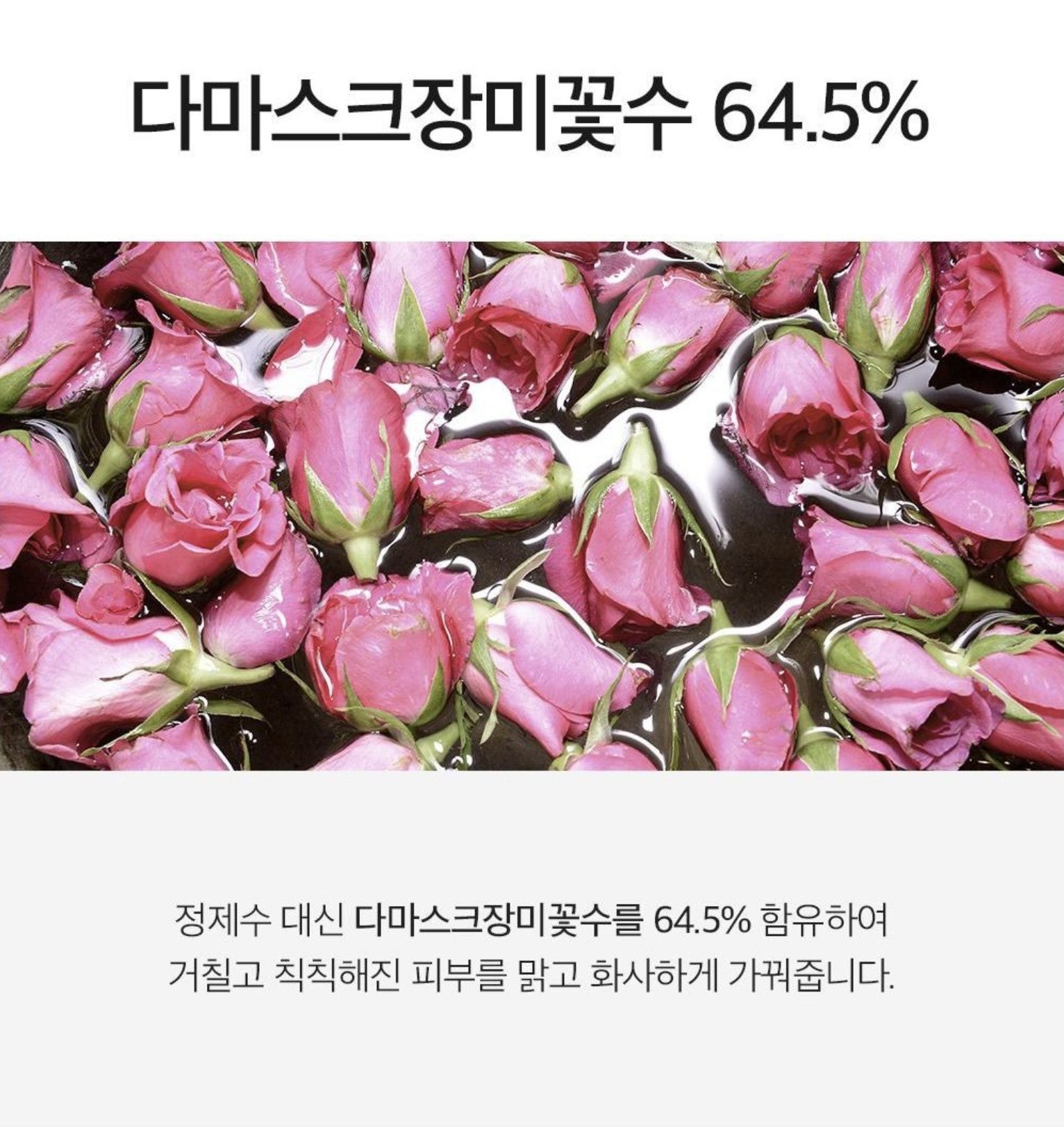 Contains 64.5% damask rose flower water instead of purified water, helping to make rough and dull skin clear and bright.