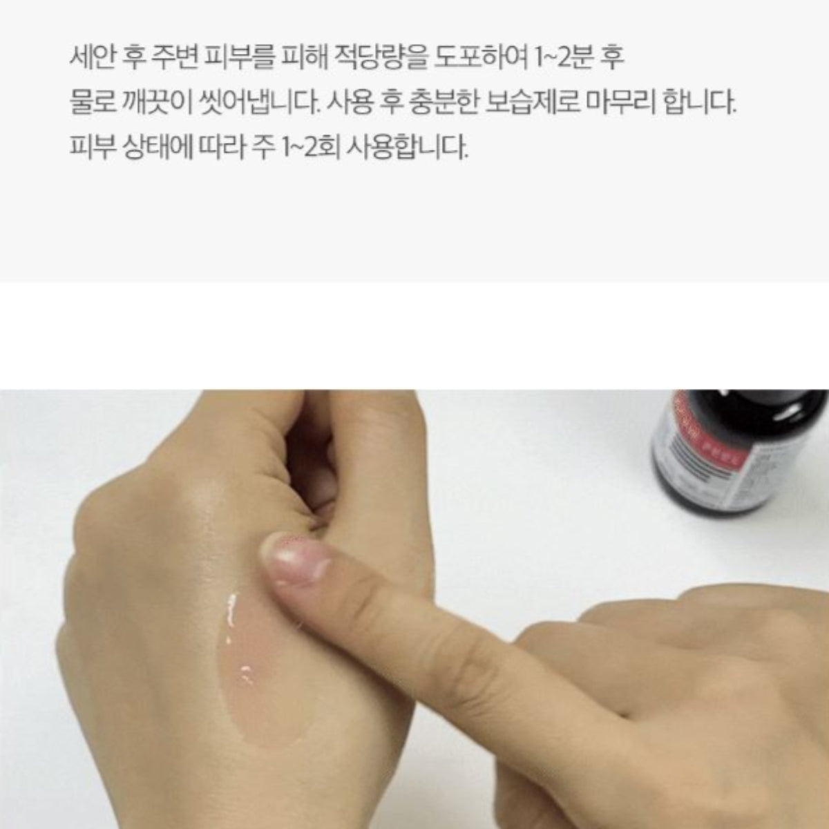 After cleansing, avoid the surrounding skin and apply an appropriate amount. Wash off cleanly with water after 1-2 minutes. Finish with a sufficient moisturizer. Depending on the skin condition, use 1-2 times a week.