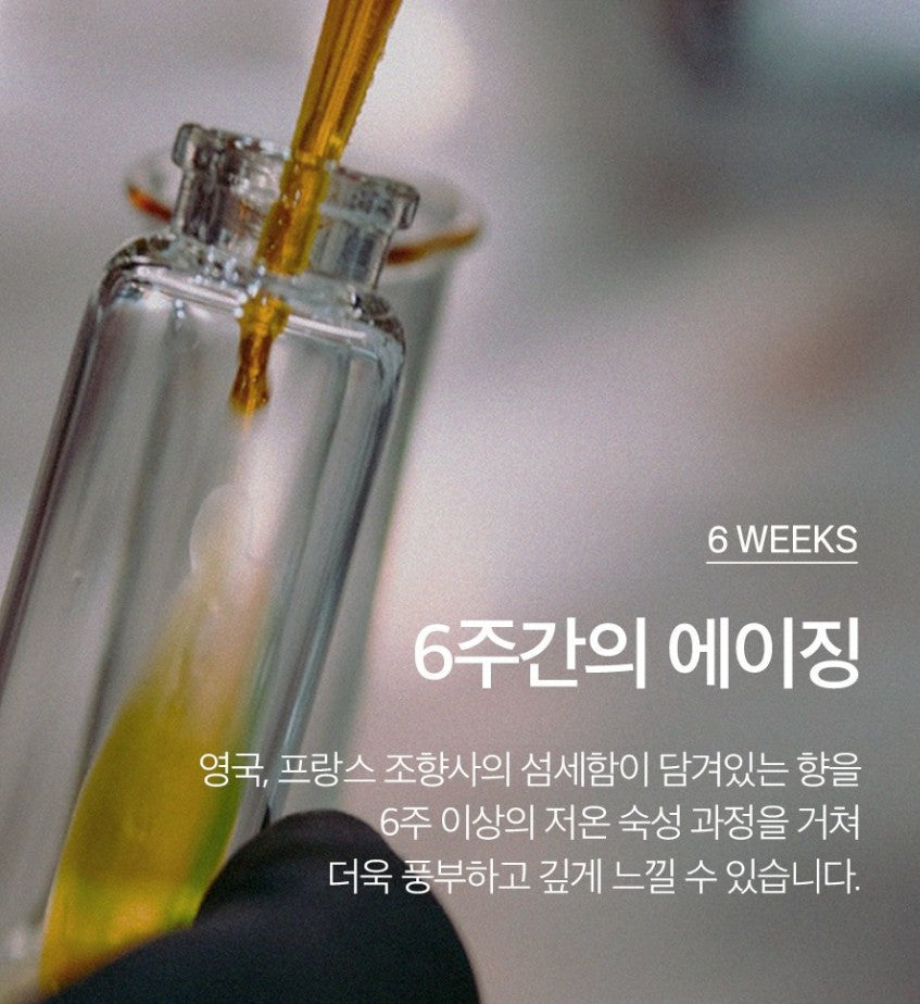 - You can feel the richness and depth of the fragrance that contains the delicacy of perfumers from England and France through a low-temperature aging process of over 6 weeks.