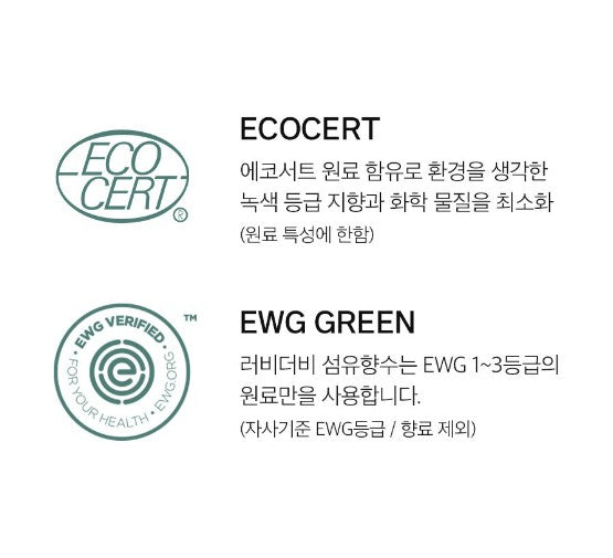 - Aim for green grade considering the environment by containing Ecocert raw materials, and use only raw materials of EWG grades 1 to 3